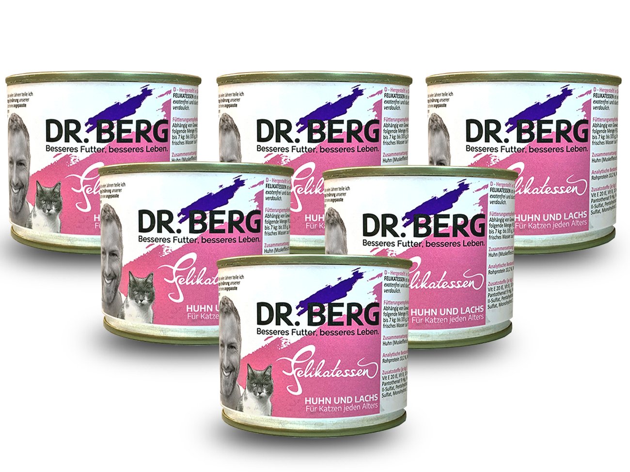 vištiena (raumenų mėsa, širdies raumuo, kepenys) 60 %, lašiša 15 %, mineralai 1 %, rapsų aliejus 0,5 %.
